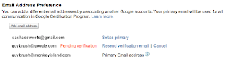 We know that qualified individuals may change companies, or use multiple email addresses throughout the day. We’ve therefore made it possible for you to add multiple Google Accounts to your account, as well as to change the primary email to which you receive communication for the Google Certification Program.